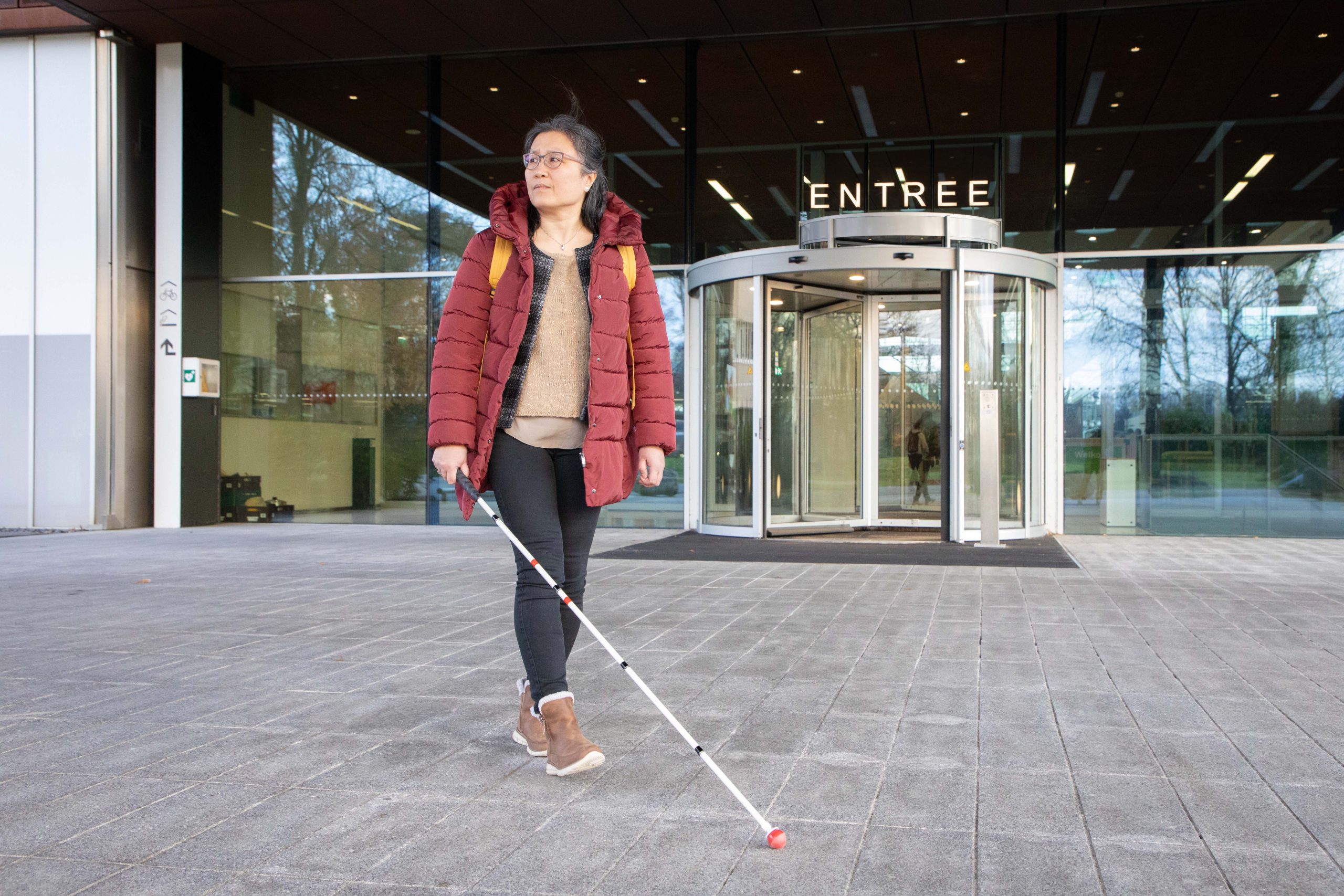 ‘Wat het voor mij stressvol maakt om mijn weg te vinden? Glazen deuren en wanden, daar bots ik soms keihard tegenaan. En traptreden zonder contrast, hoe vaak ik daar niet over gestruikeld ben. Of bewegwijzering die heel hoog hangt, dan verdwaal ik omdat ik het niet kan lezen. Echt naar vind ik veranderingen op mijn vaste routes, die niet duidelijk worden aangegeven. Zo liep ik op weg naar mijn vrijwilligerswerk een keer bijna tegen een bouwsteiger aan die er ineens stond. Toen sprong mijn hartslag even omhoog van de schrik.’